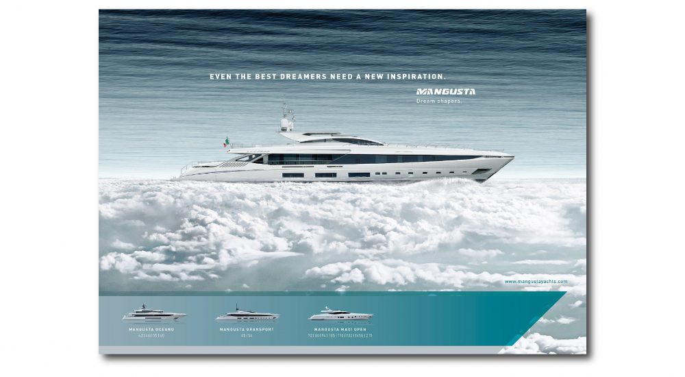 Behind the new “Dream shapers” positioning is the communication concept “We never stop dreaming”. In fact Mangusta represents a real dream factory: yachts become splendid creations capable of shaping the dreams of those who possess them.